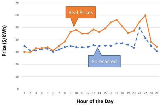 In this work, in order to fully define the cost objective the utilization of a forecasted price signal is required. For simplicity, but without compromising the generalization, the forecasted signal is taken with the naïve method [], which considers as forecasts the observed values of the same day a week ago. The forecasted as well as the real price signal, which the signals were taken from our previous work in [], are depicted in Figure 4. Furthermore, we need to evaluate the morphing bounds of each consumer’s anticipated load. In order to attain a diversity of the morphing values and exhibit a random behavior of the consumers, we implement a randomizer that provides random values of the upper and the lower morphing bounds. The randomizer provides a duet of values sampled from the following intervals: