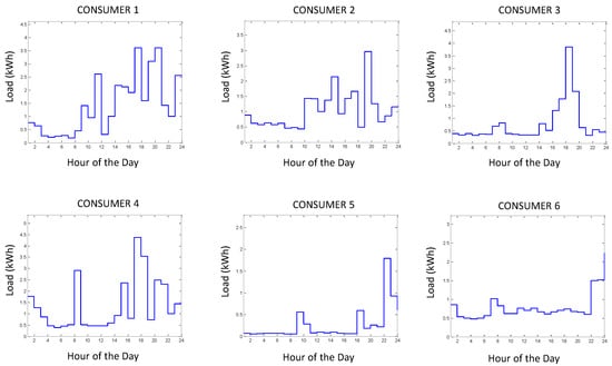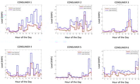 In this first scenario, we assume a small grid partition comprised of six consumers. Initially, each of the six consumers anticipates his/her day ahead load pattern; the respective load patterns for Consumers 1–6 are depicted in Figure 5. In the next step, the hourly morphing bounds of each of the consumers are obtained; the bounds pertained to the current scenarios are depicted in Figure 6 where both the upper and lower bounds are presented for all six consumers.