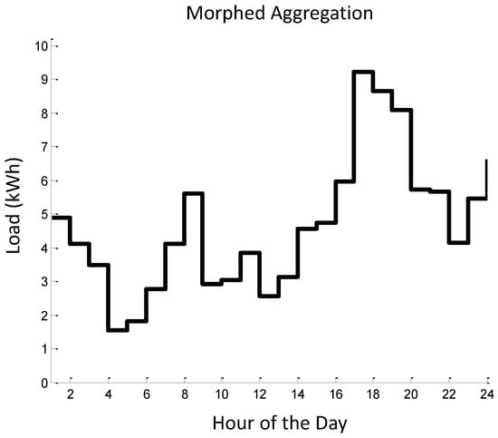 and the obtained solution is in the form of a vector whose length is equal to 24, i.e., one morphed load value for each hour of the day. The solution obtained in this specific scenario is provided in Table 1 (load values) and Figure 8 (plotted morphed pattern). We observe that the morphed aggregated pattern lies within the morphing bounds as determined in Figure 7 (as expected—thus validating our approach), while it differs from the initial aggregated pattern. Therefore, the algorithm has conducted a load morphing within the acceptable bounds that have been set by the grid partition consumers.