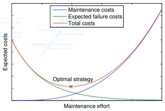 Figure 1. Relationship between expected O&M costs and Maintenance Effort. Green line show that expected failure costs reduce with the Maintenance Effort, whereas the blue line shows that the maintenance costs increase with the rise of Maintenance Effort. The sign (x) shows the optimal strategy point when the total costs are minimum [11].