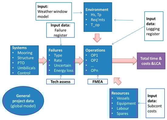 The objective of the OPERA O&M Model is to quantify the effects of each operation carried out during the project in terms of cost and carbon emissions and how the operations impact device availability. The architecture of the OPERA O&M Model is presented in Figure 2.