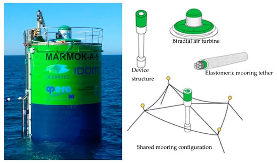 Figure 4. MARMOK-A-5 device. Device deployed at BiMEP (left-side) and device’s main components (right-side).