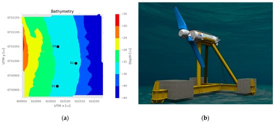 Figure 7. (a): Array of Three Turbines and bathymetry of the lease area; (b): Nova M100 tidal turbine.