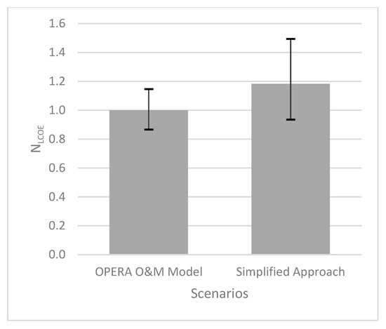 Figure 8. Normalised LCOE for the OPERA O&M Model and Simplified Approach. Error bars show the uncertainty range between results.
