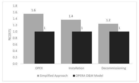 Figure 9. Normalised OPEX, installation and decommissioning costs calculated using the OPERA O&M Model and the Simplified Approach.