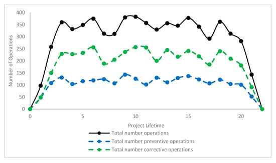 Figure 10. Variation of the number of operations a year for the OPERA O&M Model. Graph shows the number of preventive and corrective activities, as well as the total number of operations for the Array of 18 MW (72 devices).