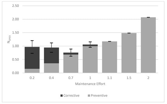 The larger the Maintenance Effort, the more frequent the preventive activities, and, therefore, smaller intervals occur between preventive interventions. The comparison between OPERA O&M Model and DTOcean O&M Module is only possible in a relative way, due to the different characteristics of the inputs. Therefore, results are normalised using the preventive cost when the Maintenance Effort is equal to 1, see Equations (6)–(8).