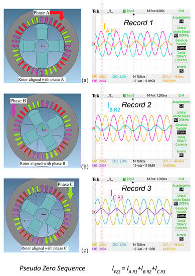 Figure 16 it can be seen that for the healthy machine case, all phases had phase difference between 0–45° with respect to the pseudo ZSC waveform. Theoretically they should be identical but the machine itself had some inherent asymmetries. Moreover, a small error might have been introduced during the experimental procedure, for example the initial rotor position was not exactly at the geometrical center of the stator.