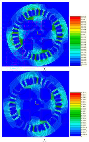 The magnetic flux density distribution at initial position for a healthy and faulty machine is shown in