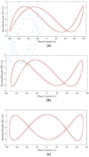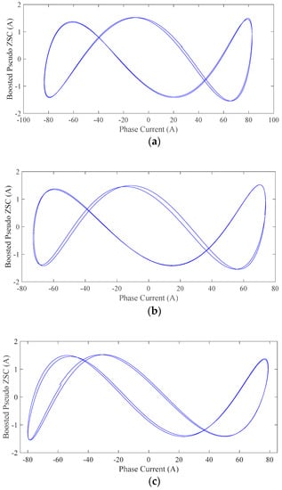 Figure 18 reveals that the Lissajous curves of the first and second phase are similar to those of the healthy machine. However, the third phase’s Lissajous curve presented a significant phase shift of the pseudo ZSC. The two signals now appeared to have 90° phase difference. This phase shift is saturation related and was caused by the improper positioning of the rotor, as also shown earlier in