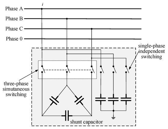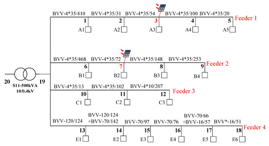 To ensure the easy integration of three-phase loads and single-phase loads, low-voltage distribution networks (LVDNs) in China generally use the three-phase four-wire wiring mode. In this mode, there are four low-voltage distribution lines, including three A/B/C phase lines and one neutral line. The three-phase loads are integrated into the three phase lines directly, and the single-phase loads are integrated into one phase line and one neutral line. In the operation of the LVDNs, a large number of single-phase loads and three-phase loads consume power at the same time. Therefore, LVDNs have the characteristics of unbalanced loads and asymmetric feeder line parameters. Moreover, with the rapid development of emerging photovoltaic (PV) technologies [1,2,3,4], a large amount of distributed PV generation connected to the LVDNs, the integration of single-phase distributed PV generation further aggravates the three-phase unbalanced operation of LVDNs. The three-phase unbalanced operating state of the LVDNs will lead to a large number of negative sequence components in the bus voltage, which is harmful to the secure operation of the transformers, generators, and so on. Furthermore, the transmission of a three-phase unbalanced current on the neutral line will also increase the active power loss of LVDNs [5]. Therefore, to ensure that the voltage deviation and the VUF of each bus in a LVDN can satisfy the secure operation requirements and decrease the active power loss of the LVDN, it is necessary to propose the corresponding solutions for optimizing the installation position, as well as the three-phase simultaneous switching capacity and the single-phase independent switching capacity of the reactive power compensation (RPC) device in a LVDN [6,7].