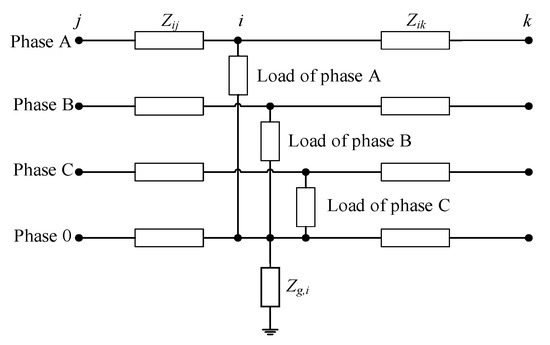 LVDNs usually adopt a three-phase four-wire radial network structure and form a return path through the neutral line. At the same time, in order to reduce the power loss and ground voltage when equipment fails, repetitive grounding of the neutral line is often used in LVDNs. Therefore, the equivalent circuit of a feeder line in a 380/220 V LVDN is shown in Figure 3. For ease of calculation, the mutual impedance and the ground branch admittance of the feeder lines are neglected, and the loads are connected between phases A/B/C and phase 0.