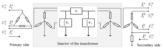 Since the actual three-phase four-wire LVDNs were usually in the asymmetry operation state, in order to obtain the operation state accurately, it was necessary to establish a detailed model of 10/0.4 kV three-phase distribution transformers. In reference [22], a three-phase transformer model based on the phase components method was proposed. The actual transformer was replaced by two ideal transformers that had high calculation accuracy, as shown in Figure 4.