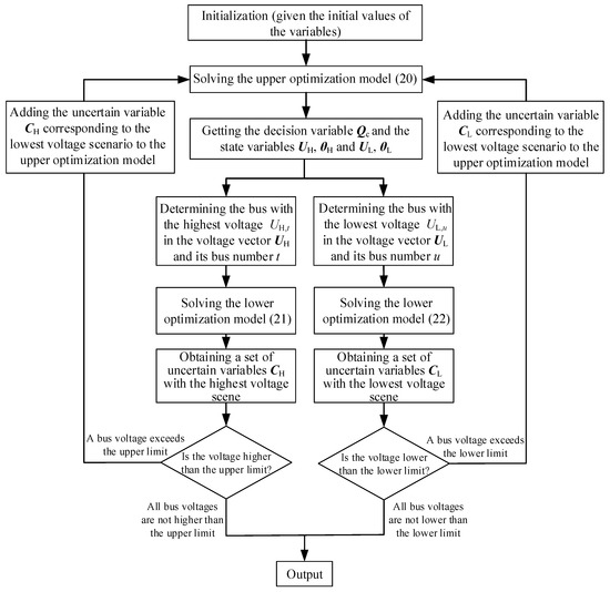 If all the bus voltages do not exceed the security limits, the output result of Qci,3 and Qci,ω is obtained. If there is a bus voltage that exceeds the security limit, add the uncertain variables CH and CL that correspond to the two extreme scenarios obtained from Steps (3) and (4) to the upper level optimization model, and return to Step (2).