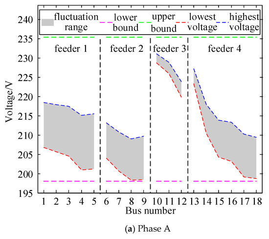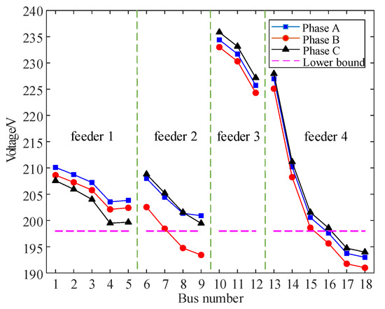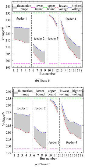 After the installation and operation of the decentralized RPC devices corresponding to the deterministic optimization, and under the expected value of uncertain variables, the voltage deviation and the VUF of each bus in the LVDN were all within the security operation limit, which significantly improved the voltage quality. The total network loss of the LVDN was 30.597 kW, which accounted for 12.93% of the total load. Hence, the total network loss was obviously reduced. However, for the situation when the actual load of each bus was 10% larger than the expected value, the light intensity was 900 W/m2, and the temperature was 30°C, the voltage of each bus under the deterministic decentralized RPC scheme is shown in Figure 7. It can be seen that the voltage amplitudes of the B phases of buses 8 and 9 are 194.754 V and 193.428 V, respectively, which are clearly lower than the lower bound of the secure operation limit (198 V). Moreover, the voltage amplitudes of the A/B/C phases of buses 17 and 18, and the voltage amplitudes of phases A/B of bus 16 were also lower than the lower bound of the secure operation limit (198 V). These low-voltage buses would affect the secure operation of the power equipment and the secure power consumption of users integrated in the buses. Therefore, although the deterministic decentralized RPC scheme could improve the voltage quality, its robustness was poor. When the load power and the PV output fluctuated, some bus voltages would exceed the secure operation limit.