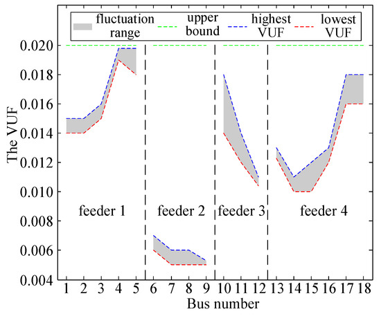 After the robust decentralized RPC scheme, for the situation when the uncertain variables fluctuated as arbitrary scenarios within their uncertain sets, the voltage fluctuation range of the A/B/C phases of each bus are shown in Figure 8, and the fluctuation range of VUF of each bus is shown in Figure 9. As can be seen from Figure 8 and Figure 9, the robust decentralized RPC scheme in Table 8 could ensure that the voltage deviation and the VUF of all the buses in the LVDN were within the qualified fluctuation range when the light intensity, temperature, and bus load changed arbitrarily within their uncertain sets, and the scheme had good robustness. Moreover, after the robust decentralized RPC scheme, the network loss of the LVDN also decreased. When the extreme scenario of the lowest voltage occurred, the total network loss decreased to 27.669 kW, which accounted for 10.60% of the total load. When the extreme scenario of the highest voltage occurred, the total network loss decreased to 15.826 kW, which accounted for 7.40% of the total load. In the expected scenario, the total network loss decreased to 21.872 kW, which accounted for 9.24% of the total load. Compared with the deterministic decentralized RPC scheme without consideration of the fluctuation of the uncertain variables, the obtained robust decentralized RPC scheme not only enhanced the robustness of the operation of the LVDN under the uncertain fluctuations of the PV output and the load power, but also reduced the total network loss. Therefore, the obtained robust decentralized RPC scheme is more suitable for practical engineering application.