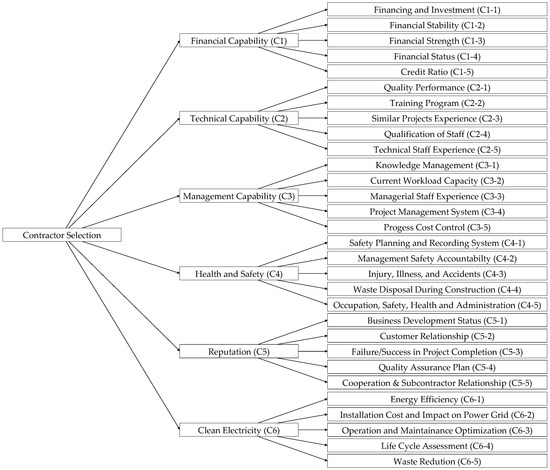 The main standard for evaluating the alternatives of an MCDM problem is the criteria. In this research, 36 criteria are used for evaluating contractors. These criteria are divided into two levels: six first-level criteria and 30 second-level criteria. Figure 1 shows the hierarchical diagram used for evaluation, where each first-level criterion consists of five second-level criteria. These criteria are deduced from the literature.