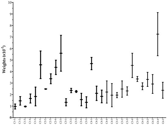 Step 2. Represent the SWARA and FUCOM weights as grey numbers. The minimum and maximum weights using both methods are scaled to obtain the grey SWARA-FUCOM weights, , respectively, where the lower bound and upper bound of the grey number is computed using Equation (13):