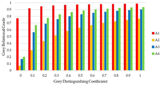 Step 7. Calculate the grey relational grade. The grey relational grey is used to obtain the overall performance of the alternative, and it is calculated using Equation (23):