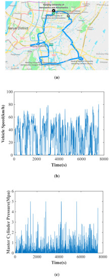 As shown in Figure 2a, the cyclic test route started and ended at Nanjing University of Aeronautics and Astronautics (marked by A) and passed by four different universities located in Nanjing (marked by B, C, D, and E, respectively). The test route mainly contains urban and rural road types. Highways were intentionally avoided as much as possible since the driving condition was smoother in urban and rural conditions, where braking maneuvers seldom occurred. The overall distance and the average velocity of the test route are around 29 km/h and 60 km, respectively. The required signals listed in Table 1 were collected at a sample frequency of 10Hz from a control area networks (CAN) bus using CANcaseXL (Vector co., Ltd., Germany). A total of 75411 data sets were collected. In Figure 2b, it can be seen that the velocity and MCP profiles present no periodic acceleration or deceleration compared with standard driving conditions, which reflects the fluctuation of vehicle speed and braking intensity with different degrees of road congestion under real driving conditions.