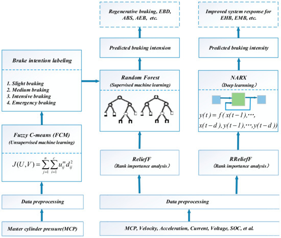 Regenerative braking has become a research focal point of electrified vehicles, since it can recover energy during the routine braking process, thus effectively overcoming range anxiety [3]. However, the variations and state fluctuations among drivers and driving scenarios bring great challenges to the development of the intelligent braking system, which is safety critical. Additionally, the concerns regarding battery health and motor efficiency are integrated into the establishment of a braking control strategy, which makes the algorithm more complicated and computationally intensive. Brake intention and intensity are integrated and control-oriented parameters that are crucial to the development of an intelligent braking strategy, such as for an electronic–hydraulic braking (EHB) system [4]. Additionally, efficient recognition of braking intention and intensity are beneficial to shorten the action time of actuators and optimize the regenerative braking strategy [5] and downshift the schedule of the transmission [6] and electric brake force distribution (EBD) [7], hence improving the safety and stability during the braking process. Moreover, the detection of emergency braking is of great importance to driver safety and advanced control techniques, including antilock braking system (ABS), autonomous emergency braking (AEB), and electronic stability program (ESP), which can be triggered in a timely manner [8,9].