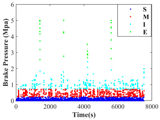 As shown in Figure 4, the range of MCP is 0–0.22 MPa, which refers to slight braking and accounts for 73.88% of the total data sets, indicating that no braking control should be adopted for the vehicle. The vehicle may drive on a bumpy road and that the slight braking is caused by the loosening of the brake pedal. The range of MCP is 0.22–0.87 MPa, which represents moderate braking and accounts for 17.98% of the total data sets. The distance between the vehicle and the forward vehicle is considered to be long enough. Riding comfort and energy recovery efficiency can be given priority during braking control. In comparison, when the range of MCP moves to 0.87–2.92 MPa, which accounts for 7.56% of the total data sets, it is considered that the distance between the forward vehicle is almost within an absolute safety distance. The driver’s desired declaration is dominant during braking control. Lastly, emergency braking is labeled when MCP exceeds 2.92MPa. However, such scenarios only account for 0.58% of the data sets. In these moments, ABS, AEB, and other emergency control systems should be involved for safety control.