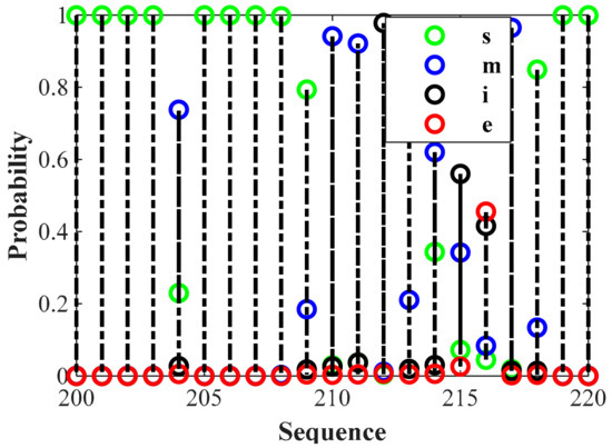 Figure 5 randomly captures a window of probabilities of 20 data sets. The green, blue, black, and red circles represent the probabilities of slight, medium, intensive, and emergency brake, respectively. The sum of the four probabilities in each group equals to 1. It can be found that the probabilities of groups 200–204, 205–208, and 219–220, belonging to slight braking, are 1, hence the other three circles on the X-axis overlap. Among them, special attention should be paid to data set 216, which belongs to intensive and emergency braking with probabilities of 41.58% and 45.55%, respectively. The probabilities of the two brake intentions are close and the emergency braking label is set with consideration of driving safety. Actually, those close probabilities of two clusters are rare and probably occur at the threshold of each cluster, but do not pose a threat to the safety and stability of the vehicle.