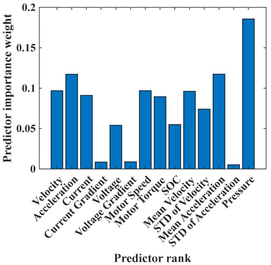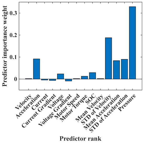 Figure 8 presents the rank importance analysis results of 14 different predictors, which exhibit certain differences in comparison to the rank importance of predictors used for brake intention prediction, as shown in Figure 6. Specifically, MCP obtains the highest weight, which is reasonable since it directly reflects the intensity of the driver who pressed on brake pedal. It is also noted that the weight of the battery current, the current gradient, and voltage gradient are negative, which may have a negative impact on the prediction performance of brake intensity. The predictors that indicate the transient kinetics of the vehicle have relatively higher weights, such as the STD of velocity, acceleration, and STD of acceleration. The influence of battery current gradient, motor speed and torque, and SOC are positive and consistent with the trend of brake intensity when regenerative braking is triggered. However, their contribution of brake intensity prediction is inconspicuous. In order to save computational time and simplify the model, those predictors with very small weights are omitted.