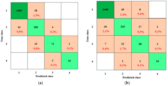 Figure 7a shows the RF predicted results presented by the confusion matrix, with a prediction horizon of 0.5 s. The overall prediction accuracy is 96.5%. Specifically, there are 1493 and 1465 data sets with actual and predicted values of slight braking, respectively, which indicates an accuracy of 98.1%. Similarly, the prediction of medium, intensive, and emergency braking intention can achieve accuracies of 93.3%, 80.9%, and 88.9%, respectively. Among the 57 groups of incorrect predictions, the brake intention levels are close. For instance, 2 emergency braking classes are incorrectly predicted to be intensive braking, among 18 in total. Therefore, this has a small impact on braking safety.