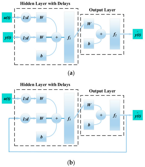 Typical configurations of the nonlinear autoregressive with external input (NARX) network during training. (a) Open-loop NARX network; (b) close-loop NARX network.