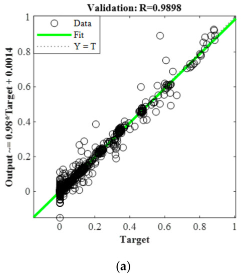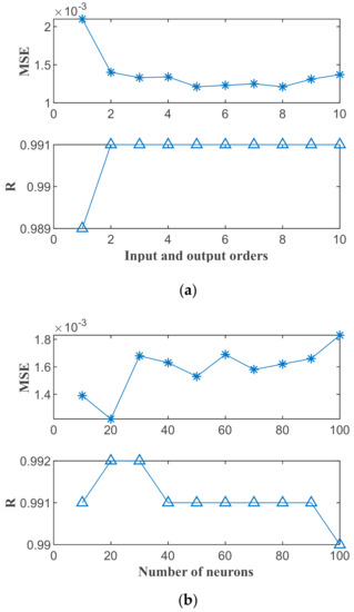 In order to evaluate the training results of the NARX network, two evaluation indices—the mean square error (MSE) and correlation coefficient (R)—were adopted. MSE indicates the error between the training output value and the expected target value, which is computed by: