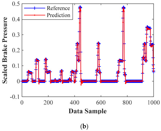 Figure 11a illustrates the linear regression performance of the trained model and the validation regression result R is 0.989. The best linear fit (green solid line) is very close to the perfect fit (black dashed line), which indicates that the simulation accuracy of the NARX neural network is very high. Figure 11b presents the brake intensity recognition results using the close-loop NARX network with 5 memory orders and 20 neurons within 1000 randomly selected samples; the close-loop NARX network has 5 memory orders, meaning data should be encapsulated in the neural network within 0.5 s. In general, the error between the predicted value and the target value is almost 0 and the error exceeds 0.1 only when the braking intensity changes suddenly. Although a small portion of the predicted brake intensity is negative, those predicted MCPs are all near zero MPa can be recognized as a glide or acceleration state and will not affect the energy management system and brake control system. Therefore, the NARX network can be utilized as a powerful brake intensity recognition model with high accuracy.