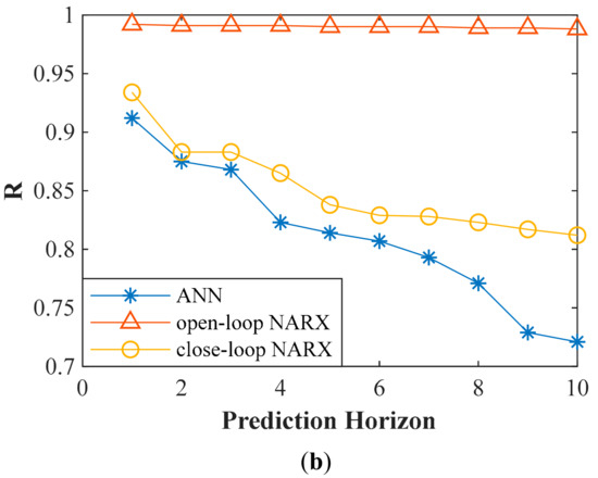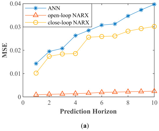 As a typical Dynamic Recurrent Neural Networks (DRNN) the configuration of the NARX network will influence its prediction performance. The NARX network can be generally trained in open-loop and close-loop modes, as shown in Figure 9 [36]. The performance comparison of brake intensity prediction using open-loop and close-loop NARX networks is shown in Figure 12. Both open-loop and close-loop NARX networks employ the LM training algorithm. Additionally, the performance of a typical SNN—the LM backpropagation (LMBP) neural network—is given as the baseline. Particular attention was paid to the performance variation, along with the increase of prediction horizon among the three models.