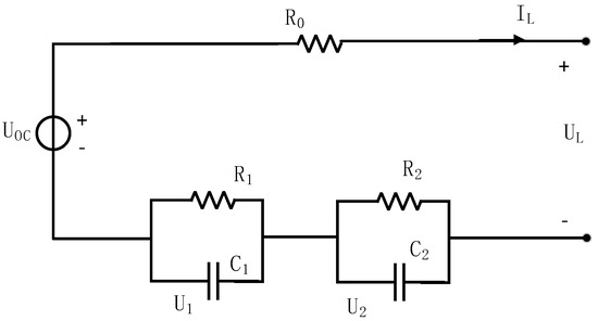 The battery performs complex redox reactions during charging and discharging process. And this process is reflected by external changes in characteristic parameters, such as changes in the open circuit voltage of the battery, an increase in the surface temperature of the battery. The role of a battery model is to describe the correspondence between the redox reaction occurring inside and the external characteristic parameters. Different battery models are usually established according to different user requirements. For example, the thermal model has an important application in the thermal analysis of the battery BMS system. The battery model not only helps us understand the battery reaction mechanism, but also helps us make better use of battery. As for SOC estimation, the accuracy of the battery model directly affects the accuracy of SOC estimation. The internal polarization phenomenon of lithium battery has obvious delay effect in the change of terminal voltage during charging and discharging. And this hysteresis effect is similar to the hysteresis effect of the resistance-capacitance network of the circuit. Therefore, researchers have proposed several equivalent circuit models with different structures to simulate the external characteristics of the battery. Equivalent circuit models are composed of common electronic components such as resistors, capacitors, inductors, voltage sources, and so on. Common equivalent circuit models include the Rint model, the PNGV model, and the Thevenin equivalent circuit model. Usually model accuracy can be improved by adding resistor-capacitor networks, while this will inevitably increase the complexity of model. Weighing model accuracy and complexity, this paper chooses the second-order resistor-capacitor (RC) network ECM to simulate the external characteristic of battery. The schematic diagram of second-order RC model is show in Figure 1. It consists of a voltage source, a resistor, and two resistor-capacitor networks. A huge advantage of this model is that every component in this model has specific meaning correspond to the Li-ion battery. The voltage source UOC(SOC) represents the nonlinear relationship between the open circuit voltage (OCV) and SOC. R0 represents the ohmic resistance of the battery. R1 and C1 denote the electrochemical polarization resistance and capacitances, respectively. R2 and C2 stand for concentration polarization resistance and capacitance, respectively.