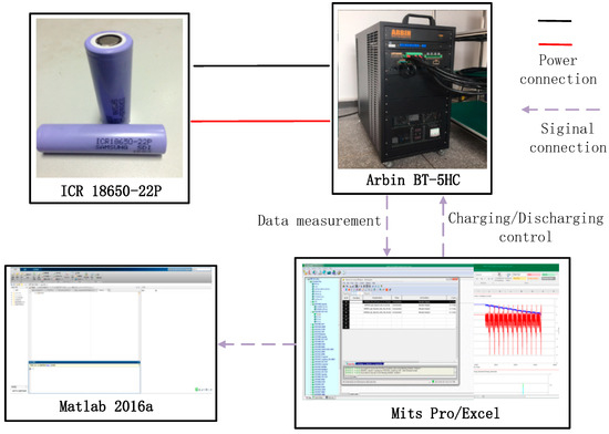 The tested battery is Lithium Cobalt Oxide battery (ICR18650-22P SAMSUNG SDI). Details about the battery and test conditions are listed in Table 1. The discharging and charging process is performed in Arbin BT-5HC battery test system. The current and voltage measurement accuracy of the equipment is 0.02% full scale range (FSR). The sampling time is 1 s. The Mits Pro is used to make charging/discharging strategy, send control signals and receive data from the equipment. After the charging/discharging process finishes, the data is imported to MATLAB 2016a for analysis. Figure 2 is the schematic diagram of the test bench.