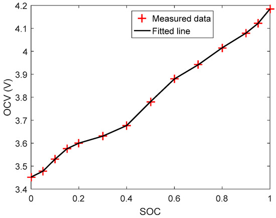 The correspondence between open circuit voltage and state of charge is one of the most important characteristics of a lithium battery. Unlike battery capacity, the OCV-SOC relationship is less affected by discharge rate, temperature, and battery aging. Therefore, it can be used to determine SOC of the battery. Here the following steps are used to measure OCV of the battery: (1) Fully charge the battery with CC-CV method and set aside for 2 h; (2) Measure the terminal voltage and record it as the OCV of the battery at 100% SOC; (3) Discharge the battery to 95% SOC at 0.2C and set aside for 2 h; (4) Measure the terminal voltage of the battery and record it as the OCV of the battery at 95% SOC; (5) repeat step (3) and step (4) to get the OCV of the battery at 90%, 80%, 70%, 60%, 50%, 40%, 30%, 20%, 10%, 5%, 0% SOC, separately. The measured data are listed in Table 2.