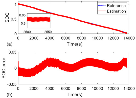 SOC estimation result under FUDS condition: (a) SOC; (b) SOC error.