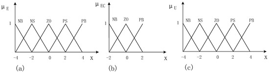 The crisp input variables of the fuzzy logic controller are the observation error and variation in observation error . The crisp output variable is the value of . Usually, is bounded in ±0.2 V, and is bounded in ±0.05 V. reflects the proportion of sliding mode feedback in the entire feedback amount. It is bounded in 0 to 1. The domain of can be discretized into [−4, −3, −2, −1, 0, 1, 2, 3, 4]. The domain of can be discretized into [−2, −1, 0, 1, 2]. And the domain of output variable can be discretized into [−4, −3, −2, −1, 0, 1, 2, 3, 4]. We use the linguistic variable E to represent , and EC stands for . U stands for . The term set of fuzzy input E is designed as {“Positive Big” (PB), ”Positive Small” (PS), “Zero” (ZO), “Negative Small” (NS), “Negative Big” (NB)}. Considering that EC varies more slowly than E, The term set of fuzzy input EC is designed as {“Positive Big” (PB), ”Zero” (ZO), ”Negative Big” (NB)}. And the term set of fuzzy output U is designed as {“Positive Big” (PB), ”Positive Small” (PS), “Zero” (ZO), “Negative Small” (NS), “Negative Big” (NB)}. From the corresponding relation between crisp domain and discretized domain, we can calculate the values of quantization factor KE, KEC, and scale factor KU.