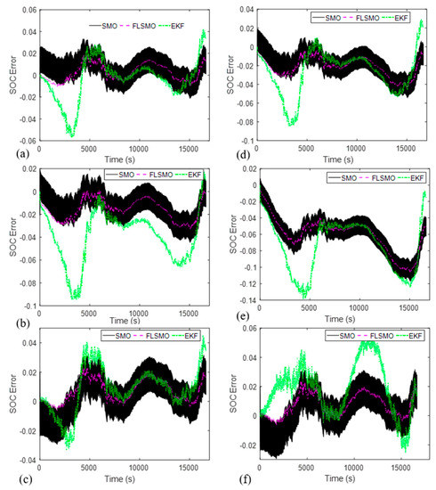 In practical application, the voltage and current data are inaccurate because of sensor error and electromagnetic interference and so on. The Arbin battery test equipment used in this paper has a high estimation accuracy. In order to test the robustness against current and voltage noise of the FLSMO algorithm, the offset noise and random noise are used. To contrast, the SMO algorithm and the EKF algorithm are also applied in this test. To be more specific, the current noise includes 0.1 A offset, 0.5 A offset, and 0.1 A random noise. The voltage noise includes 0.02 V offset, 0.05V offset, and 0.01 V random noise. The WUVSUB schedule is applied. The estimation result of different method under different noise condition is shown in Figure 9. The mean of absolute error (MAE), maximum error (MaxE), and root mean square error (RMSE) are recorded in Table 6. From Figure 9 and Table 6, it is clear that the FLSMO algorithm has better performance than the SMO algorithm and EKF algorithm in terms of robustness against current and voltage noise.