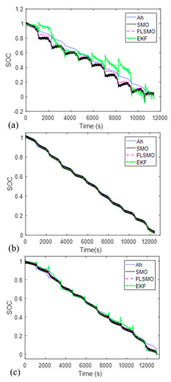 To verify robustness against parameter disturbance of the FLSMO algorithm, the New European Driving Cycle (NEDC) schedule test is implemented under 5, 25, and 45 °C, separately. The SOC estimation results are shown in Figure 10 and Table 7. In different temperature, the parameters of 2RC equivalent circuit model varies greatly. The SOC estimation error becomes larger under 5 and 45 °C, compared with 25 °C, while the FLSMO algorithm has a smaller estimation error than the SMO algorithm and EKF algorithm under all temperature conditions. This test result shows that the FLSMO has better performance than the SMO algorithm and EKF algorithm in terms of robustness against parameter disturbance.