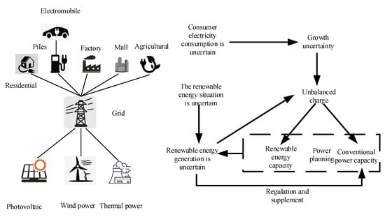 The power plan is generally based on the source and load conditions to make a power plan when the grid structure and parameters are determined [,]. Since the user’s electricity behavior is not regulated by the power system, the load is quite random. In the traditional GEP, the power supply side uses conventional energy for power supply, which can provide continuous and stable power supply. Therefore, only load uncertainty is considered in the conventional GEP. In a low-carbon economy, the power supply side will be transformed from a single energy structure into a multi-energy structure in which new energy such as wind, light, and conventional energy are developed in concert. Because wind energy and solar energy are greatly affected by the climate, and the climatic conditions are uncontrollable and random, this results in the random uncertainty of photovoltaic and wind power output [,,,,,]. This feature makes the source-network-load model of the power system transform from load uncertainty to source load uncertainty, and the GEP problem becomes more complicated. The source-network-load model in a low carbon economy is shown in Figure 2.