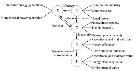 For the sake of generality, let the generation expansion focus on m objective functions and record the set of indicators as . Corresponding to the above model, there are:
