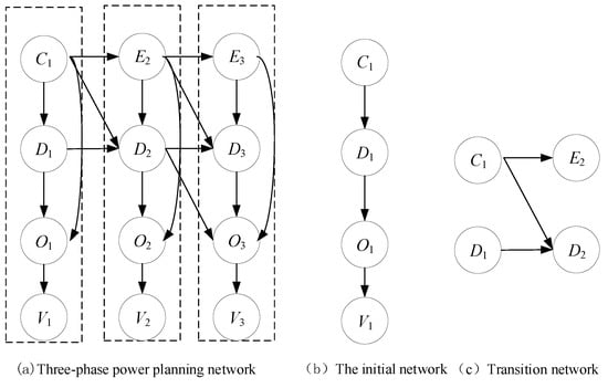 Dynamic Bayesian network (DBN) is a probability graph model used to represent the dependence between variables, which provides a concise and effective method for the expression and inference of causality. This method has been applied in power system reliability analysis and fault diagnosis because it can represent the preference, probability estimation, and information state of decision-makers through nodes and directed edges, and at the same time, it can make use of the conditional independence between variables and provide decision-makers with intuitive and accurate logical relations. For example, reference [] established a component-based DBN fault diagnosis model for the application of a genetic algorithm in the power system fault diagnosis. Based on certain inference rules, the objective function of the genetic algorithm was formed according to the DBN, and the genetic algorithm was used for optimization and solution. In [], for the problem that the analytical method is difficult to analyze the reliability of the distribution system when the scale of the distribution system increases, a distribution system reliability evaluation reasoning algorithm was proposed based on DBN timing simulation, which can intuitively find out the weak links of the system.