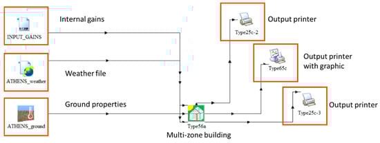 Each building has been modelled in a transient simulation environment using the software TRNSYS [] to obtain the hourly energy demand for heating and cooling. Figure 2 outlines the model implemented in TRNSYS, which is mainly based on the Type 56 [], which allows the simulation of the building. The ground floor of the building consists of a concrete slab where the ground temperature, calculated via the Type 77 of TRNSYS, has been applied as the boundary condition. The heating and cooling system has been modelled as an ideal convective system able to maintain the air temperature inside the dwelling equal to the set-point, which was 20 °C and 26 °C in heating and cooling, respectively; the relative humidity has been also controlled on 50%. Using TRNSYS for the borehole heat exchangers utilizes the approach proposed by Hellström [], where the borehole length, the type of ground heat exchanger, and the thermal properties of the ground have to be set by the user; for this reason, only the building was simulated so that the borehole parameters could be set in the DSS by the user, according to the case-study investigated. The energy required for domestic hot water has been neglected because it depends mostly on the occupancy of the building and the low efficiency periods of the heat pumps should be avoided. Eventually, the energy profile of the DHW can be calculated separately and summed up at the thermal load profile of the building.