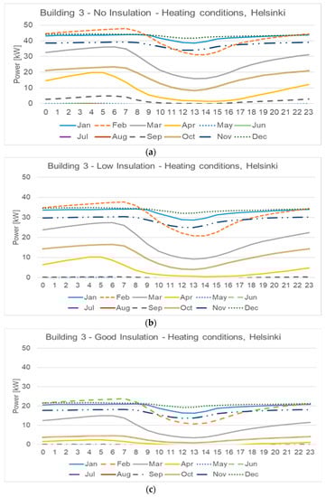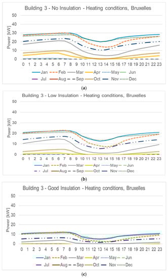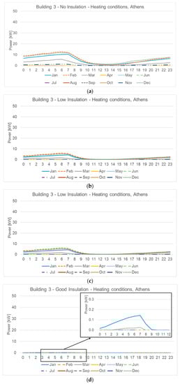 Figure 3 outlines hourly profiles for heating and cooling of a typical apartment block in Athens. In particular, Figure 3a–c show the heating energy demand for no insulation, low and good insulation, respectively. Moving from no insulation (Figure 3a) to good insulation (Figure 3c), the average thermal power decreases by more than 95%. The HDD value (995) is lower than that of the other climates, and, consequently, the peak of the profiles is low. On the contrary, the maximum value of the cooling energy demand is about 40 kW for the case with no insulation (Figure 3d). As can be seen, when the thermal insulation level raises the cooling energy demand increases, especially for the first and last months of the cooling season, whereas the value corresponding to the design month (August in this case) slightly decreases. This thermal behaviour is due to the combination of the effects of internal gains, weather conditions, and thermal properties of the structures; this result can be observed in each location, even if it is more evident in Athens, due to the more severe weather conditions during the cooling season.