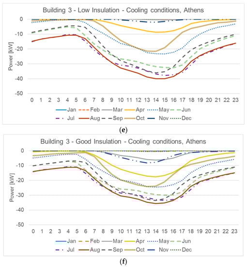 Hourly sensible load of the average monthly day for Building 3. Athens (Csa) climate conditions: (a) Heating conditions and no insulation, (b) heating conditions and low insulation, (c) heating and good insulation, (d) cooling condition and no insulation, (e) cooling condition and low insulation, (f) cooling condition and good insulation.