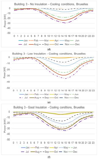 Hourly sensible load of the average monthly day for Building 3, Bruxelles (Cfb) climate conditions: (a) Heating conditions and no insulation, (b) heating conditions and low insulation, (c) heating conditions and good insulation, (d) cooling condition and no insulation, (e) cooling condition and low insulation, (f) cooling condition and good insulation.