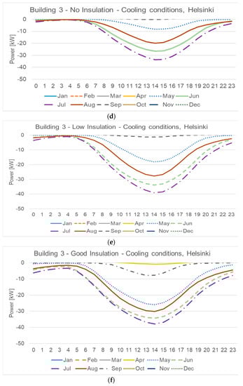 Hourly sensible load of the average monthly day for Building 3, Helsinki (Dfb) climate conditions: (a) Heating conditions and no insulation, (b) heating conditions and low insulation, (c) heating conditions and good insulation, (d) cooling condition and no insulation, (e) cooling condition and low insulation, (f) cooling condition and good insulation.