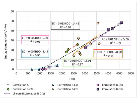 Furthermore, the annual specific energy demand per floor area and the DDy have been correlated using a simple linear regression. First, a correlation was found as a linear regression among all the locations; this correlation has been named “Correlation A”. A further analysis was then carried out, separately considering the locations in the same climate class; therefore, five additional correlations were obtained, one for each Köppen–Geiger climate class involved in the analysis: This method is referred as “Correlation B”.