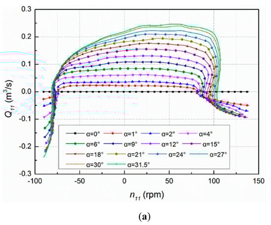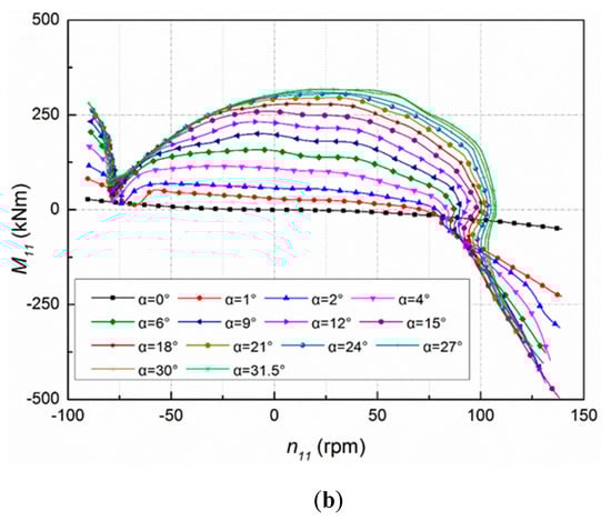In Figure 2, the abscissa is the unit speed. The ordinate are unit discharge and unit moment , respectively, and is the guide vane opening.